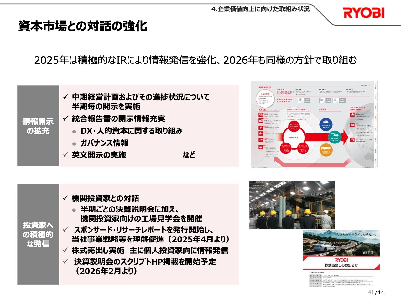 資本市場との対話については、投資家のみなさまへの積極的な情報発信に努めています。具体的には、投資家向け工場見学会の開催、新規投資家向けのスポンサードリサーチレポートの導入、さらに、決算説明会スクリプトのホームページ掲載をこの2月から開始する予定です。